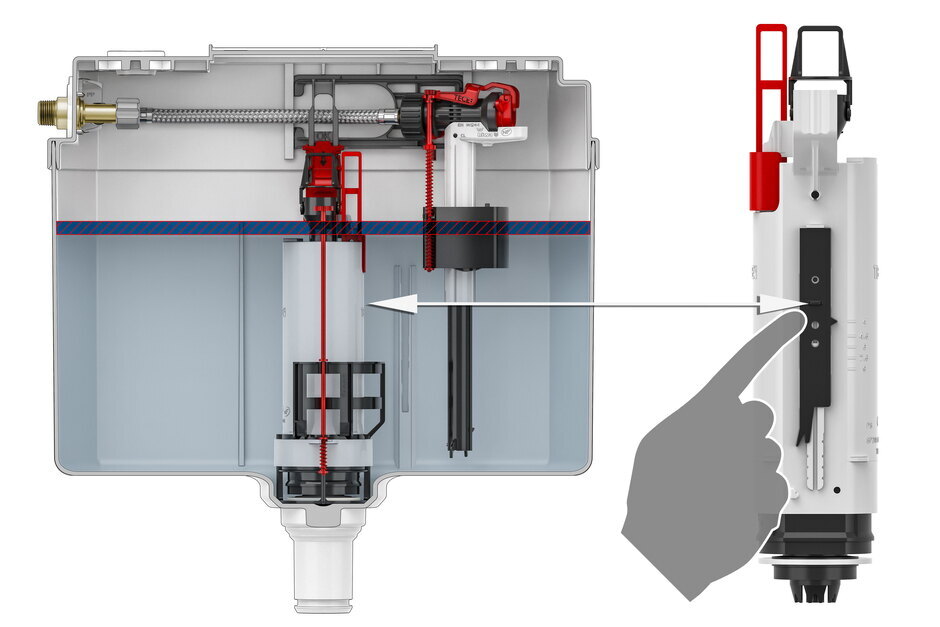 در کنار این تنظیم، سطح آب داخل فلاش‌تانک نیز باید حدود ۱ سانتی‌متر پایین‌تر آورده شود؛ یعنی ابتدا تنظیم حجم فلاش از طریق اسلایدر روی شیر تخلیه A2 انجام می‌شود و سپس سطح آب از روی شیر پرکن تنظیم می‌گردد. نتیجه‌ی این کار، تنظیم دقیق فلاش ۴/۲ لیتری با حدود ۰٫۵ لیتر کاهش سطح آب است.